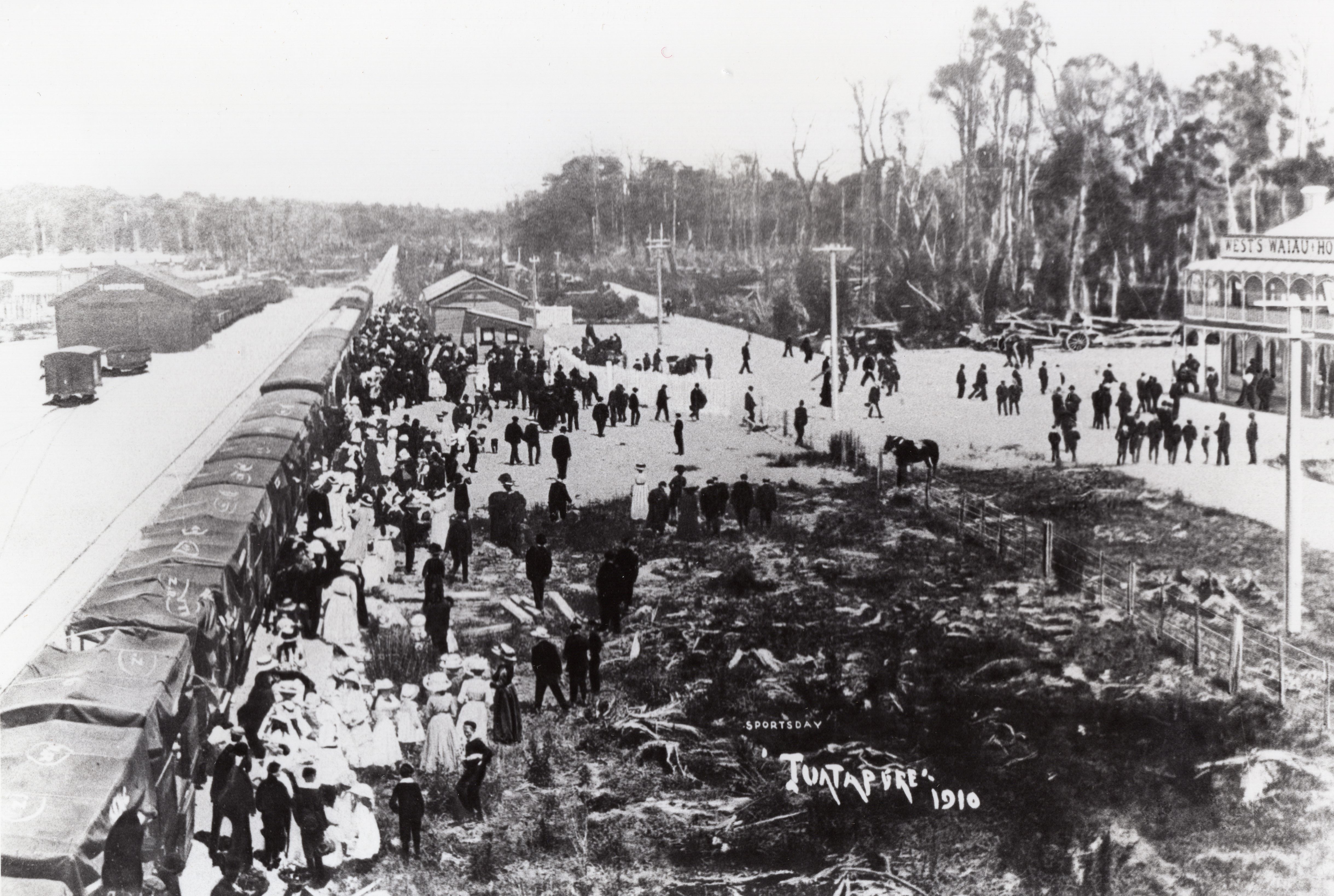 Passengers alight their train to attend the very first Tuatapere Sports in 1910. Photo: Central & Western Archive