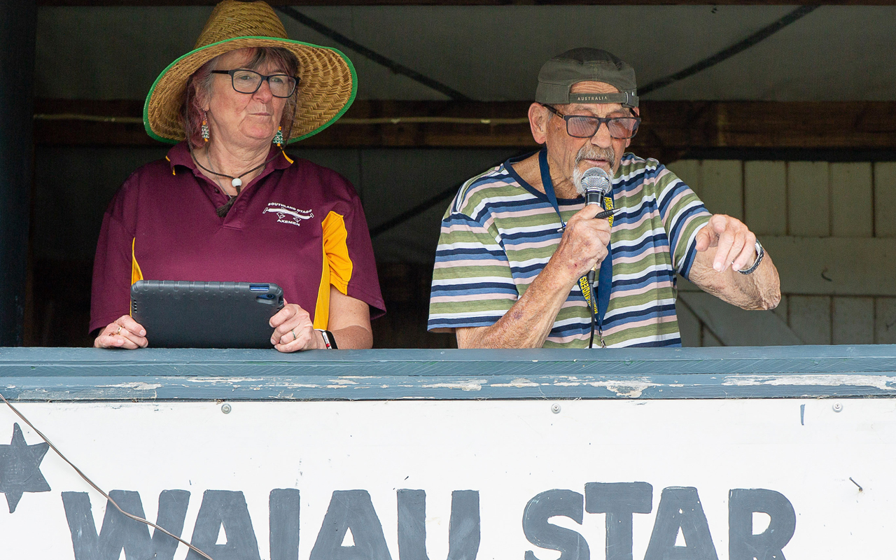 Announcer and long-time president of the Tūātapere Axemen's Athletic Society Peter Templeton (right), 78, commentates at the town's final sports day. Photo: Advento Photography