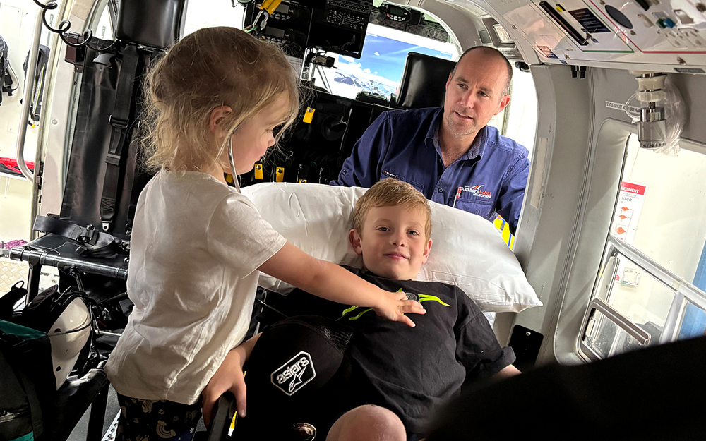 7-year-old Ben (centre) tries out Southern Lakes Helicopters' rescue helicopter for comfort, while his sister Chloe acts as 'the doctor'. Southern Lakes Helicopters Safety Manager Richie Hunter looks on. Photo: Southland App
