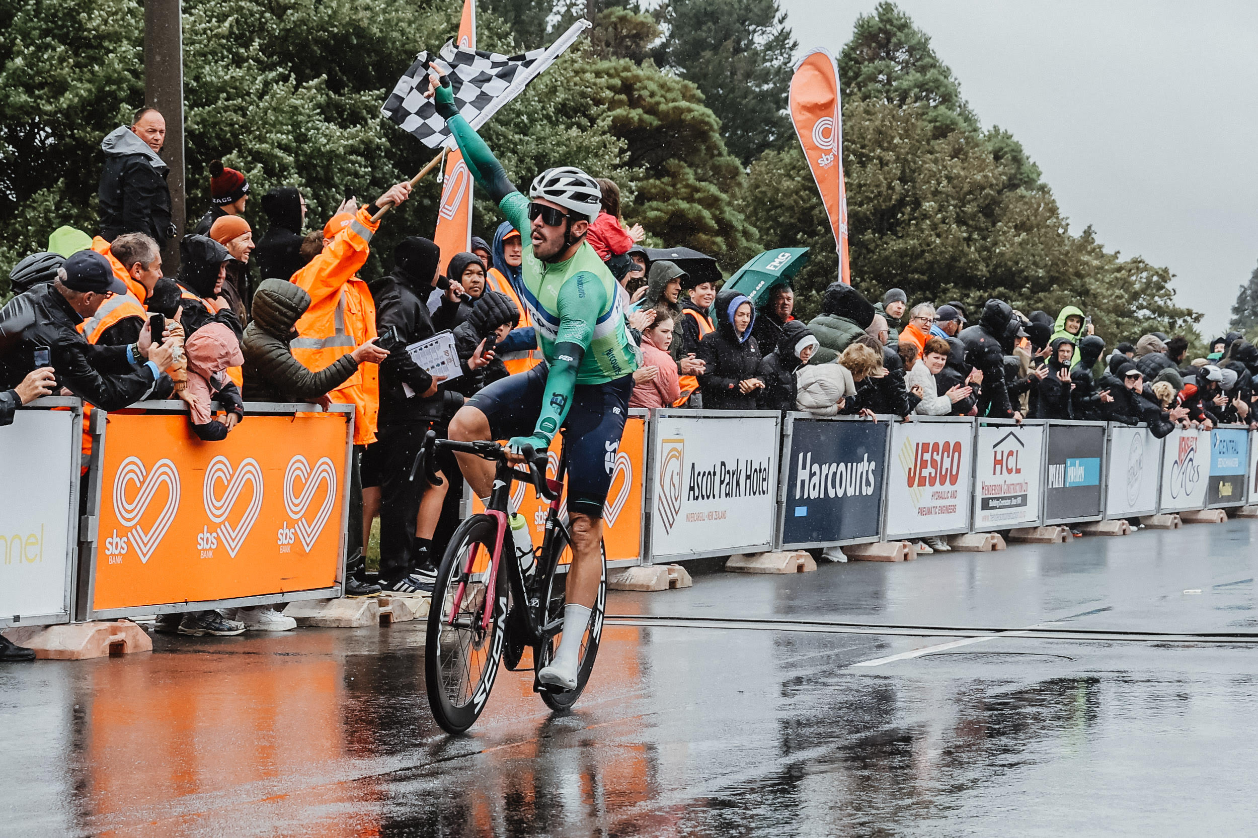 Wet and cold conditions didn't stop the adulation as Nick Kergozou wins the final stage of the 2025 SBS Bank Tour of Southland in Winton. Photo: Supplied