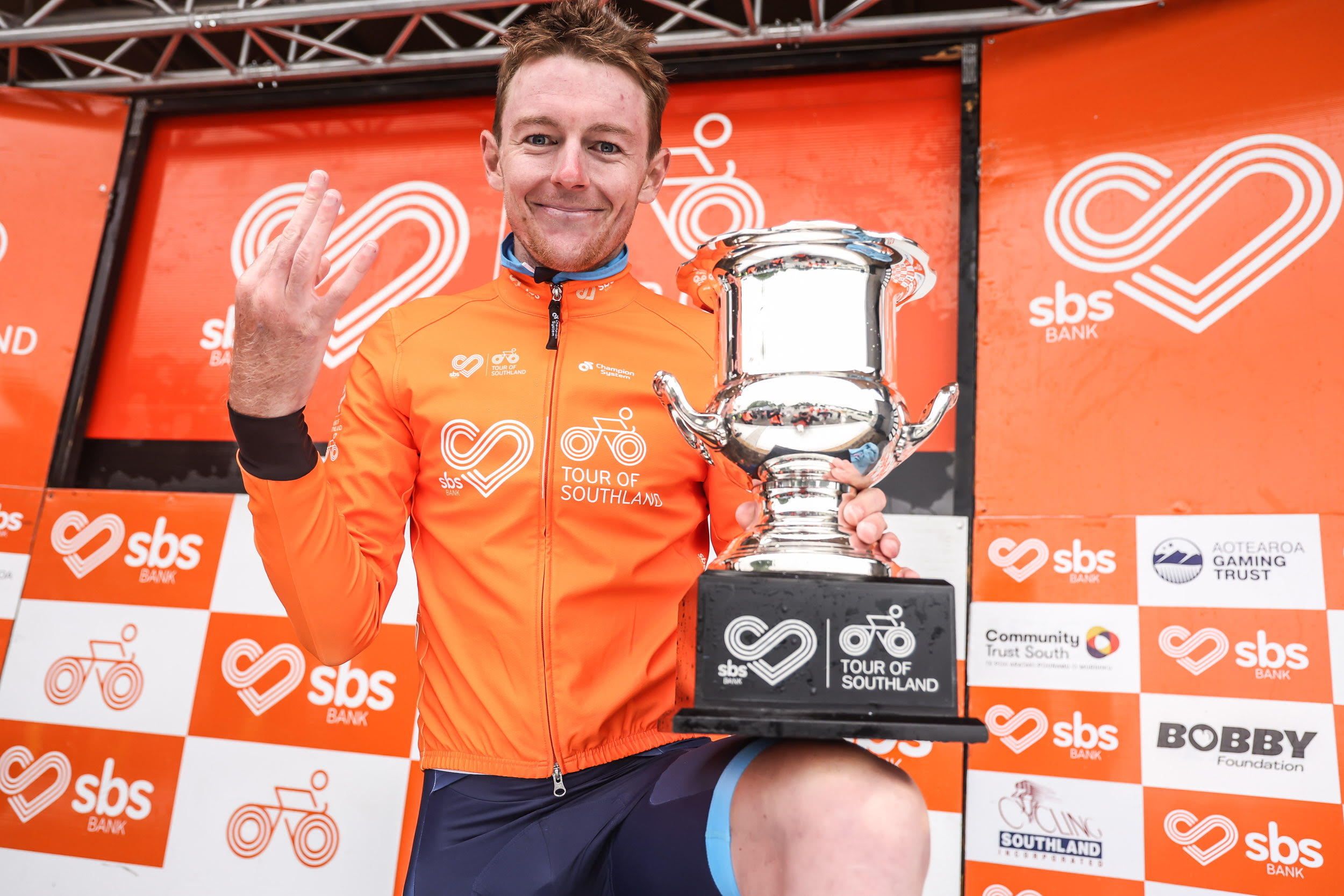 Josh Burnett celebrates his third Tour of Southland title. Photo: SuppliedJosh Burnett has become just the sixth rider to win three or more SBS Bank Tour of Southland titles after surviving a frenetic final day today.