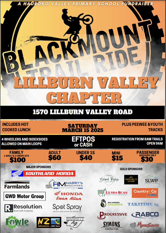 If you are keen on a trail ride, we have the amazing annual Blackmount Trail Ride on Saturday 15th March. This year we have a change of location with our families up the Lillburn hosting. Check the poster for all details. We look forward to seeing you there for a fabulous feast of food, views, trails, and of course good old Southland hospitality! Thank You to our amazing sponsors for their support. Your contributions enable us to provide resources to support our learners. You make a BIG difference to what we can do for our people and place - THANK YOU!