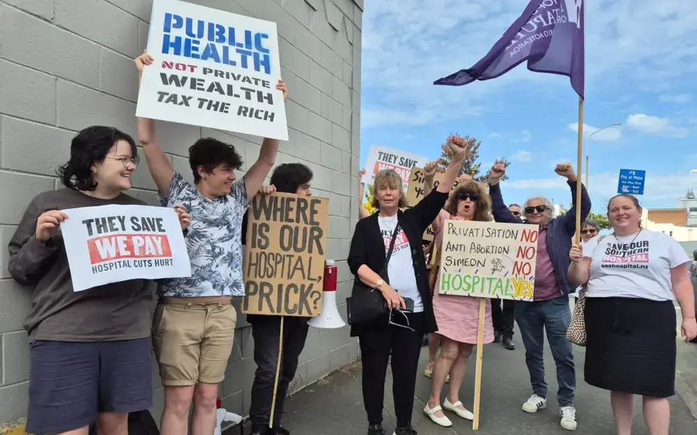 Protesters at the hospital on Thursday. Photo: RNZ / Delphine Herber