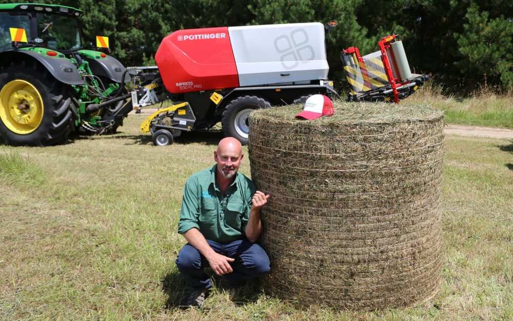 The inventor with a bale wrapped in his netting Photo: Grant Lightfoot/Supplied