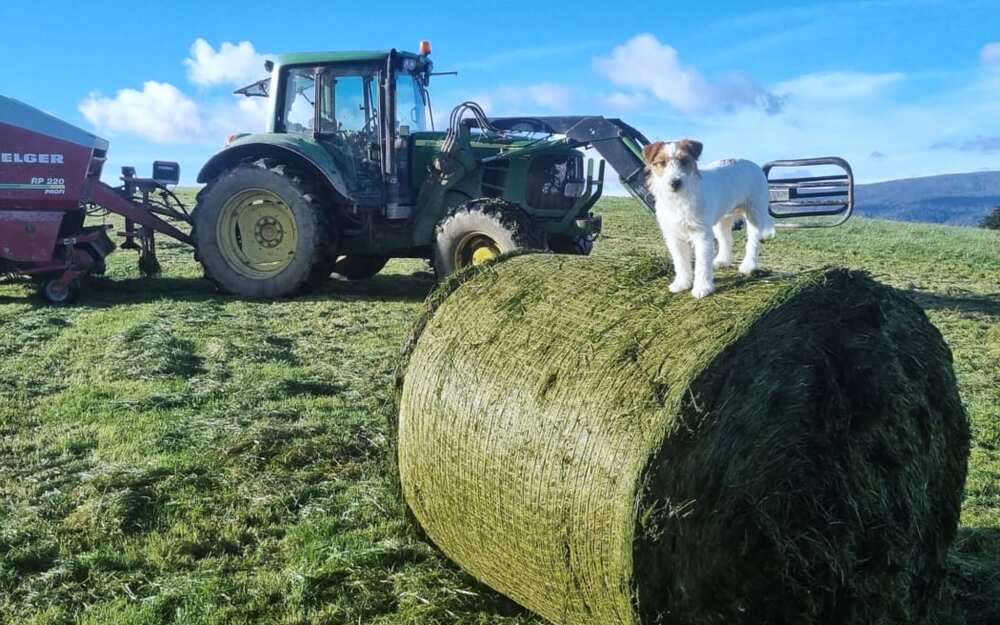 Grant's dog stand proudly on baleage freshly wrapped in the Econet Photo: Grant Lightfoot/Supplied