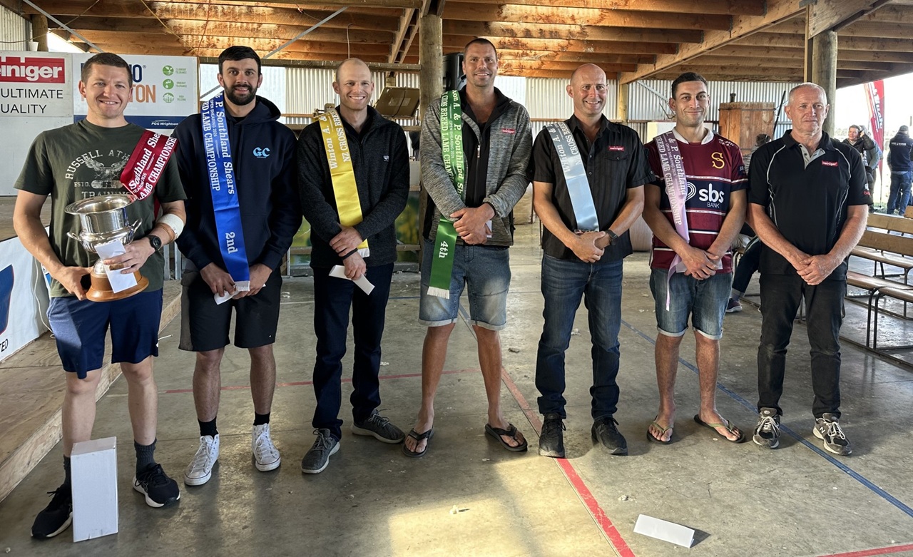 The Open shearing final lineup at the New Zealand Crossbred Lambs championships on Saturday, with winner and Eketahuna shearer Hemi Braddick at laft. Photo / Shedtalk.Eketāhuna shearer Hemi Braddick moved a step closer to a potential World Championships spot after claiming his first national title during a big two days of shearing competition in Southland on Friday and Saturday.