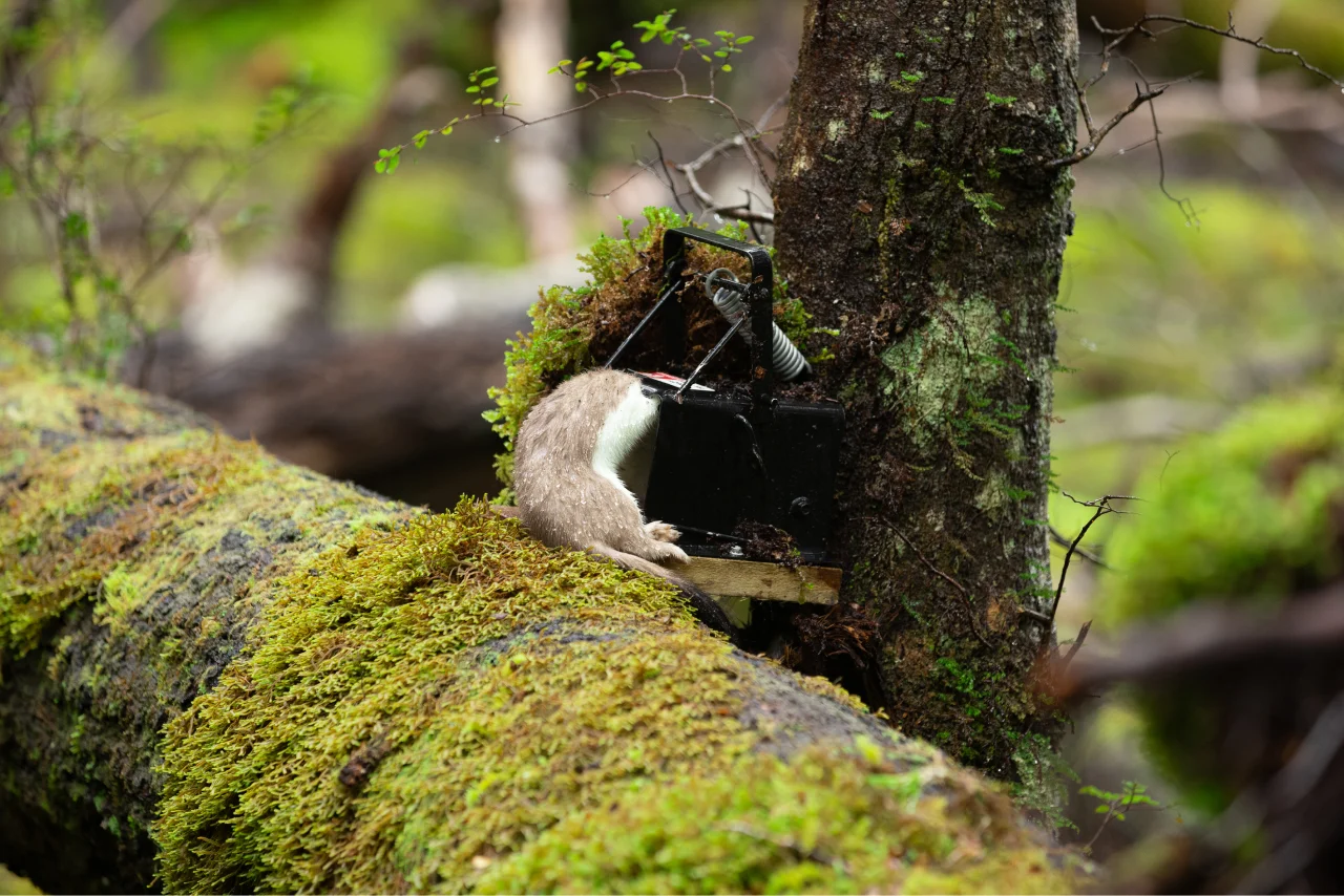Another kill trap catches a stoat, an apex predator he’s pleased to remove from Fiordland.