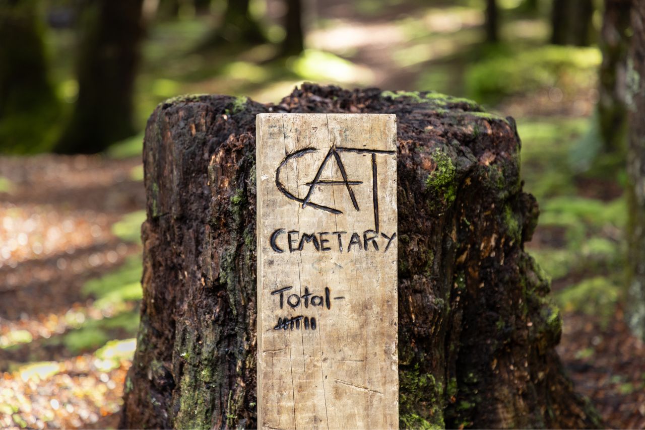 He buries them in lumpy ground behind the hut; four mounds of dirt, neatly lined up with a shared wooden tombstone announcing the feral cat graveyard with four tally marks burnt in.