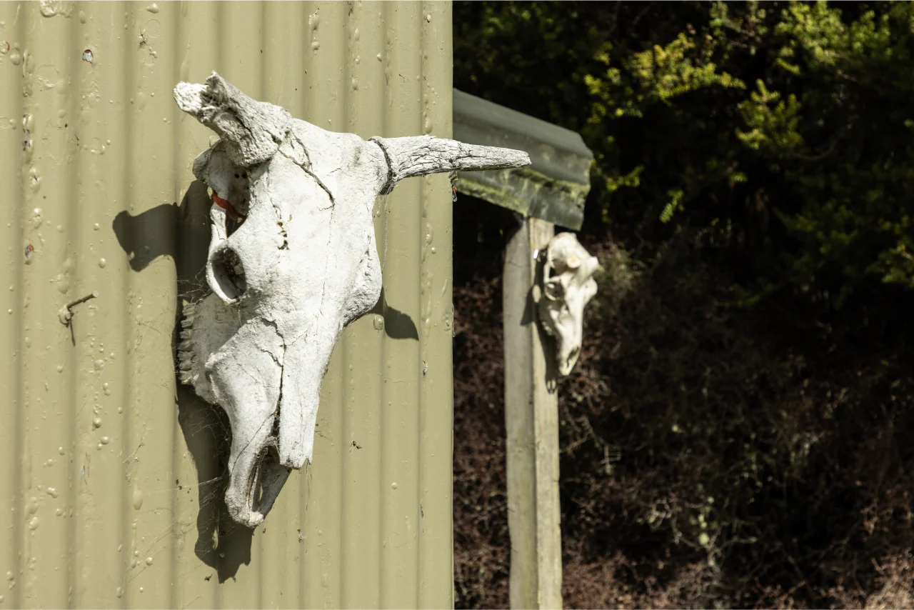 A cow skull adorns its exterior and inside there’s just four bunks, a small bench and an incongruous tattered office chair next to the fireplace.