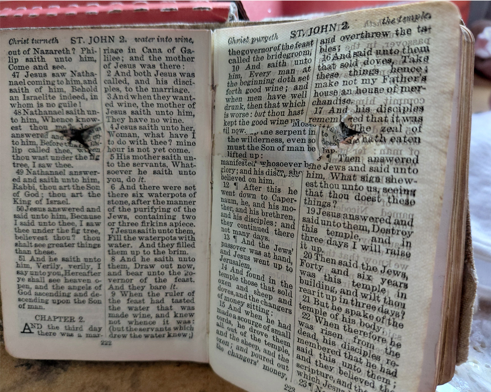 The WW1 bible which still holds the bullet that tragically took the life of young Tokonui soldier John Shankland. Photo: Supplied