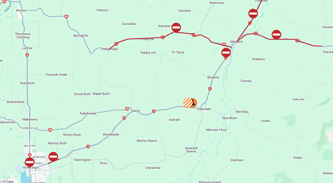 - State Highway 1, Mataura, between the intersections of Glendhu Road and Charlton Road, due to fallen trees. The detour for northbound traffic is to turn left on to Glendhu Road, right on to Townsley Road, left onto McBride Road, right on to Charlton-Siding Road, then left back onto SH1. The reverse applies for southbound traffic.