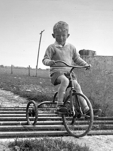A young Lindsay Wright negotiating the farm cattle stop on his trike. Photo: Supplied