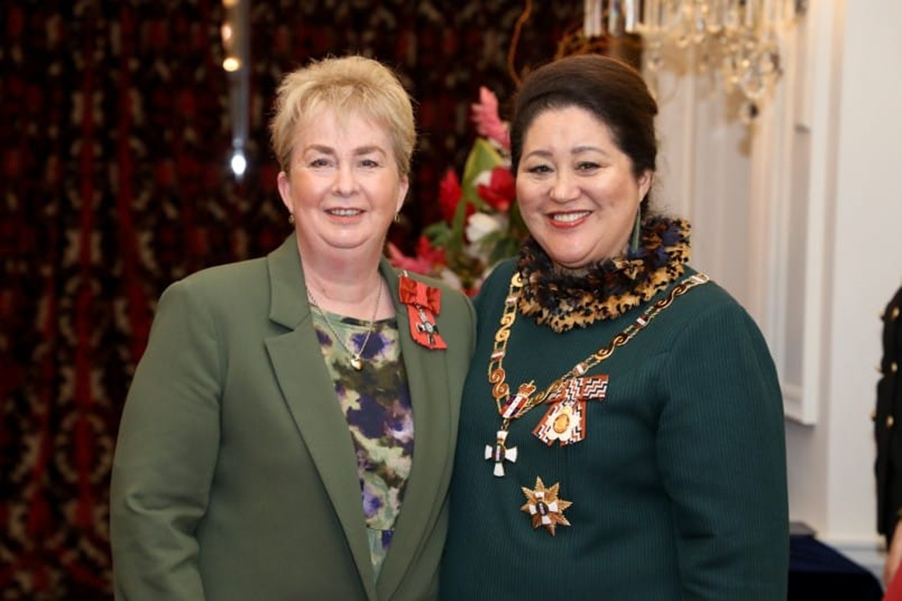 Yvonne Browning was presented her Member of the New Zealand Order of Merit (MNZM) - for services to education and youth - by the Governor-General, Her Excellency The Right Honourable Dame Cindy Kiro, in September 2023. Photo: Supplied