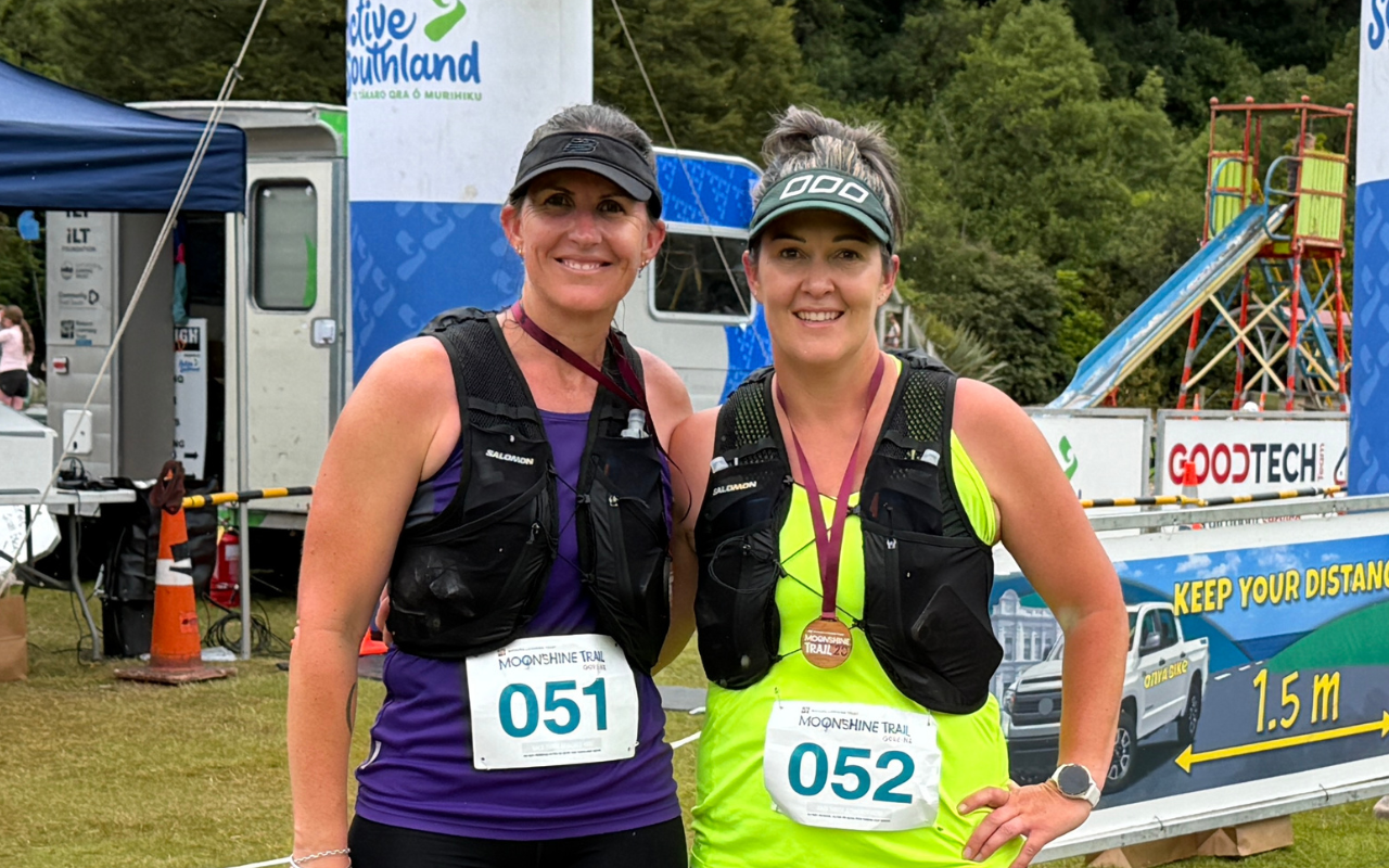 Rachel Little, left, and Amy Hamilton, celebrate after completing the 15km off road run at the MLT Moonshine Trail at Dolamore Park, near Gore, on Saturday. Photo: SuppliedThe MLT Moonshine Trail celebrated its 20th year in style at Dolamore Park on Saturday (February 14).