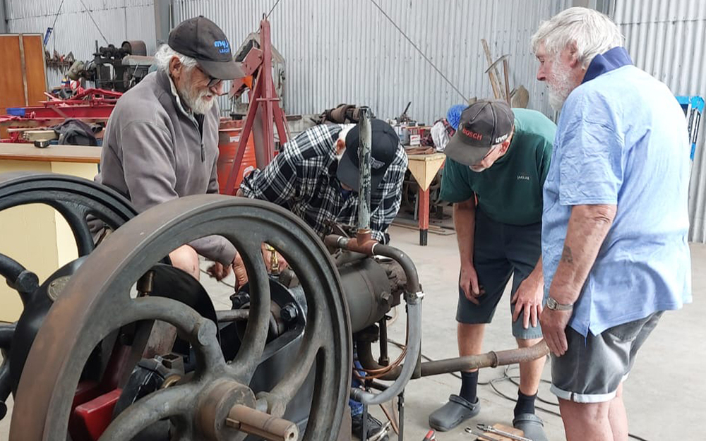 From left: Russell Cloake, Merv Cloake (obscured), Bob Anderson and Garth McCombe gathered around a 1911 Blackstone oil engine. Photo: Alina Suchanski