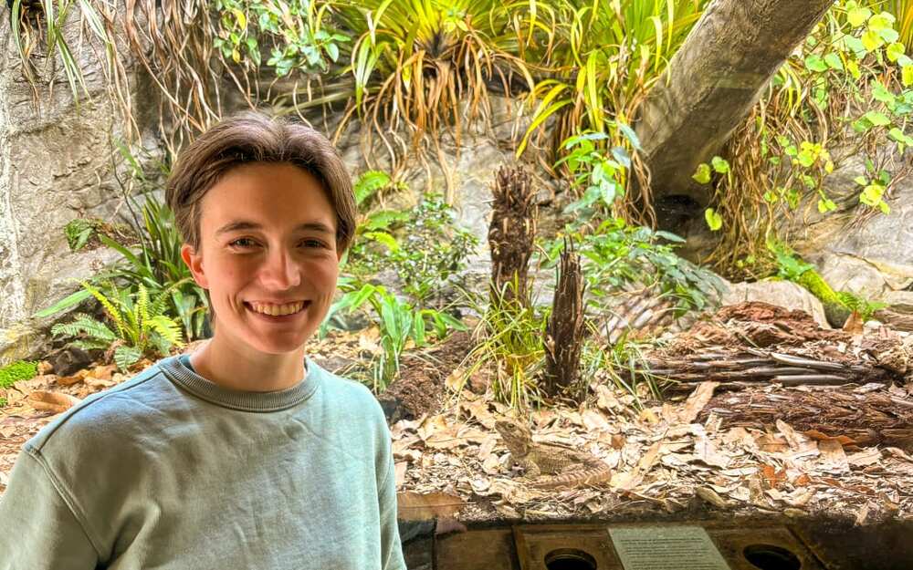Cam Hoffbeck, PhD candidate, at the Auckland Zoo tuatara display. Photo: Claire Concannon / RNZ