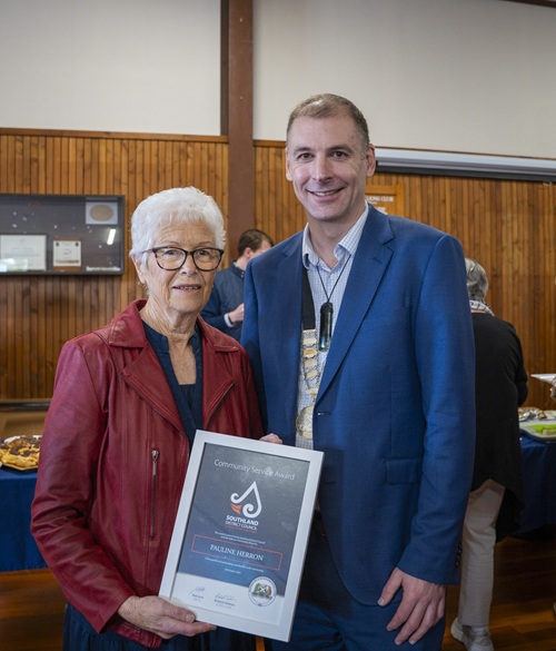 Pauline Herron is presented with a Community Service Award by Southland Mayor-elect Rob Scott at Riversdale. Photo: Southland District CouncilAt an emotional Community Service Award presentation in Riversdale today, Pauline Herron was honoured for her outstanding life-long commitment to northern Southland.