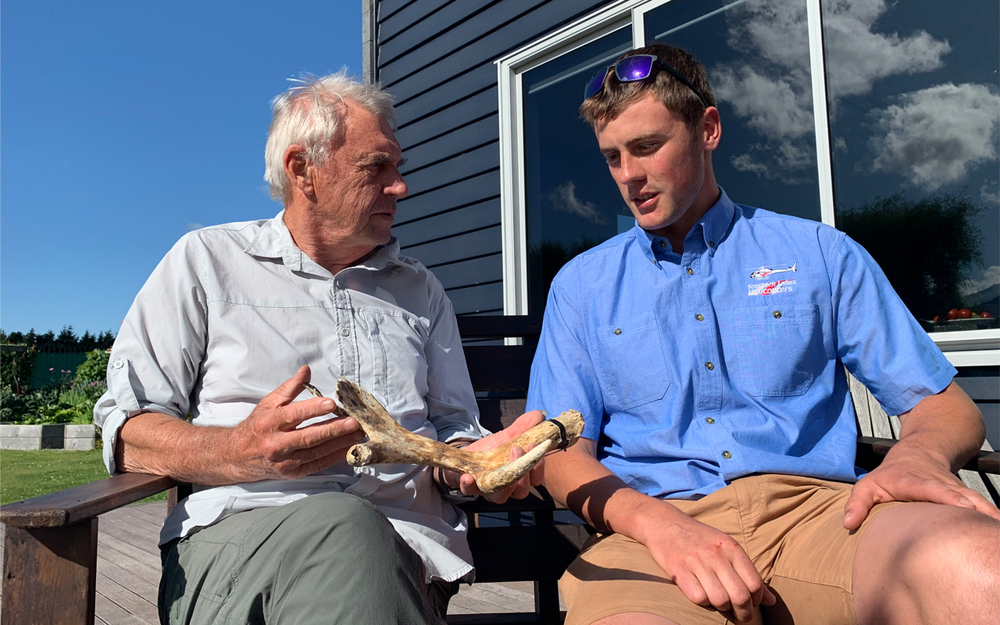 Ken Tustin talks with helicopter pilot Ben Young in March 2020, after Young spotted a moose in Fiordland National Park. Photo: Kirsty Macnicol/Southland App