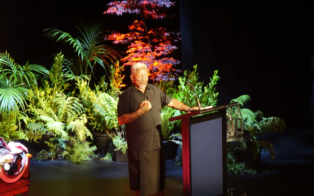 Māori artist and activist Tame Iti speaking at Sir Tim Shadbolt's funeral. Photo: Katie Todd