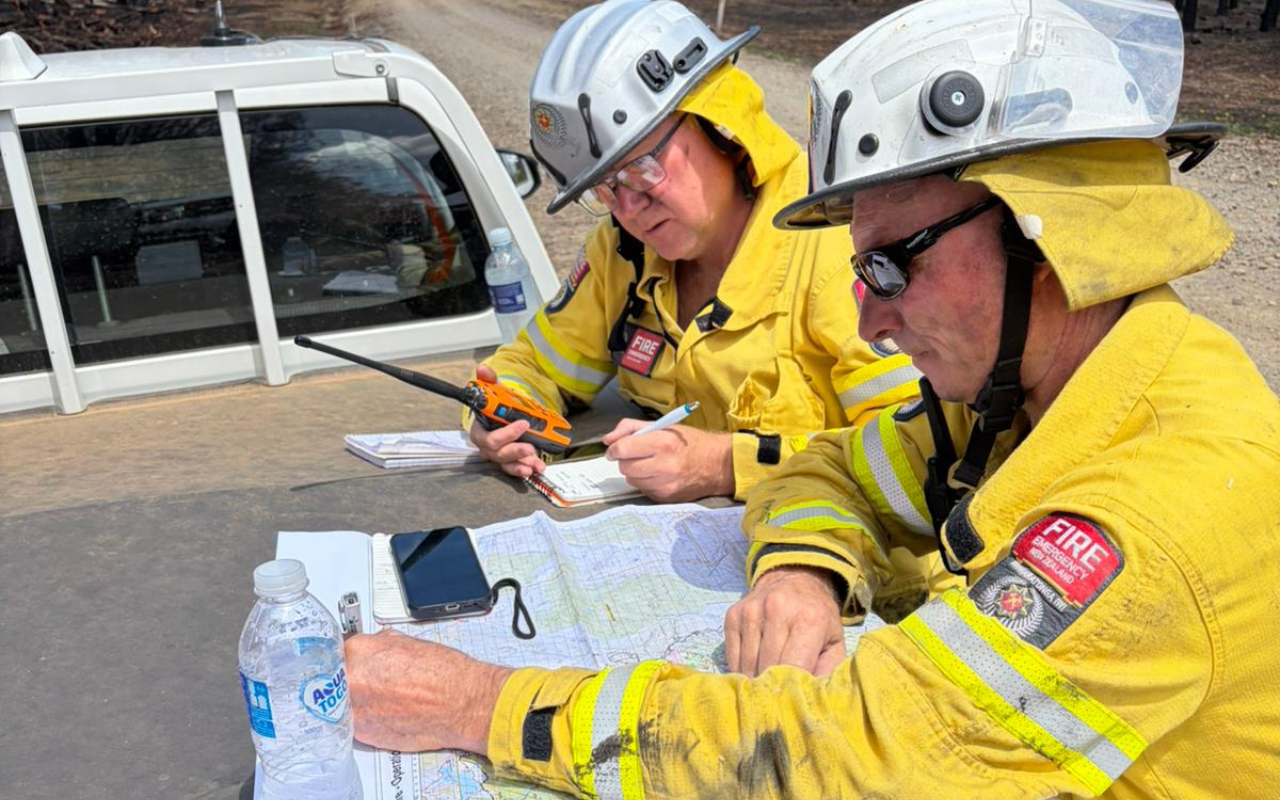 FENZ Northern Southland group manager Area Commander Hamish Angus, left, and Hedgehope Fire Chief Ken Keenan, right, plotting a report of a flare-up which their crew responded to. Photo: Supplied