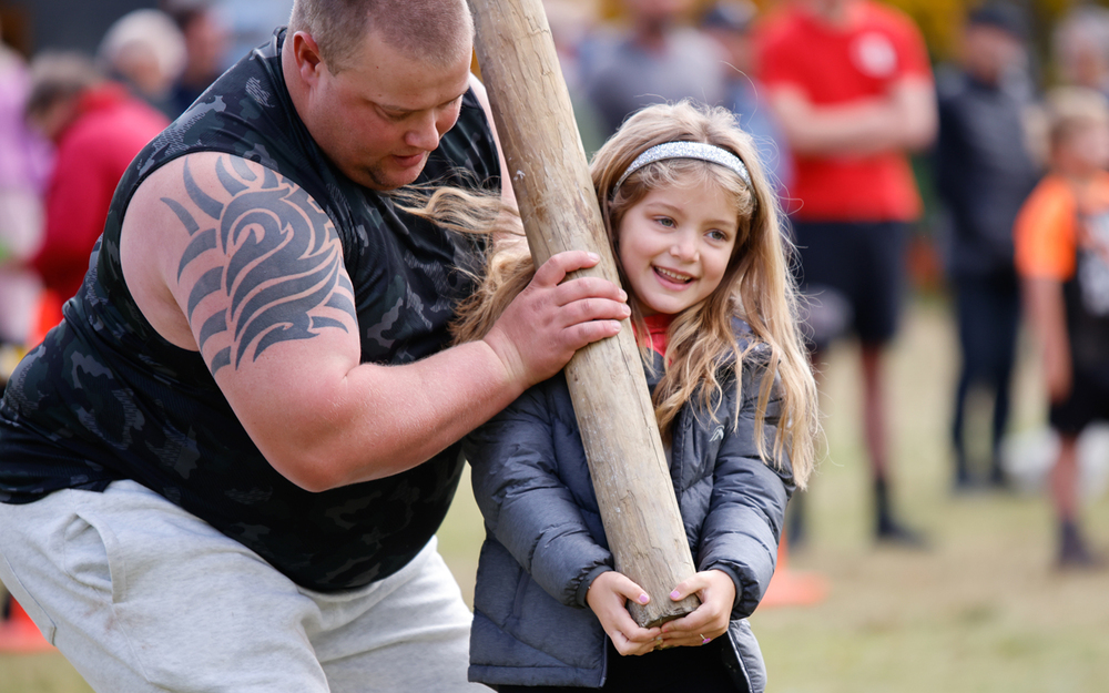 A young competitor gets a helping hand in the 2023 'Toss the Caber' have-a-go field event that the Tartan Festival had become famous for. Photo: Supplied