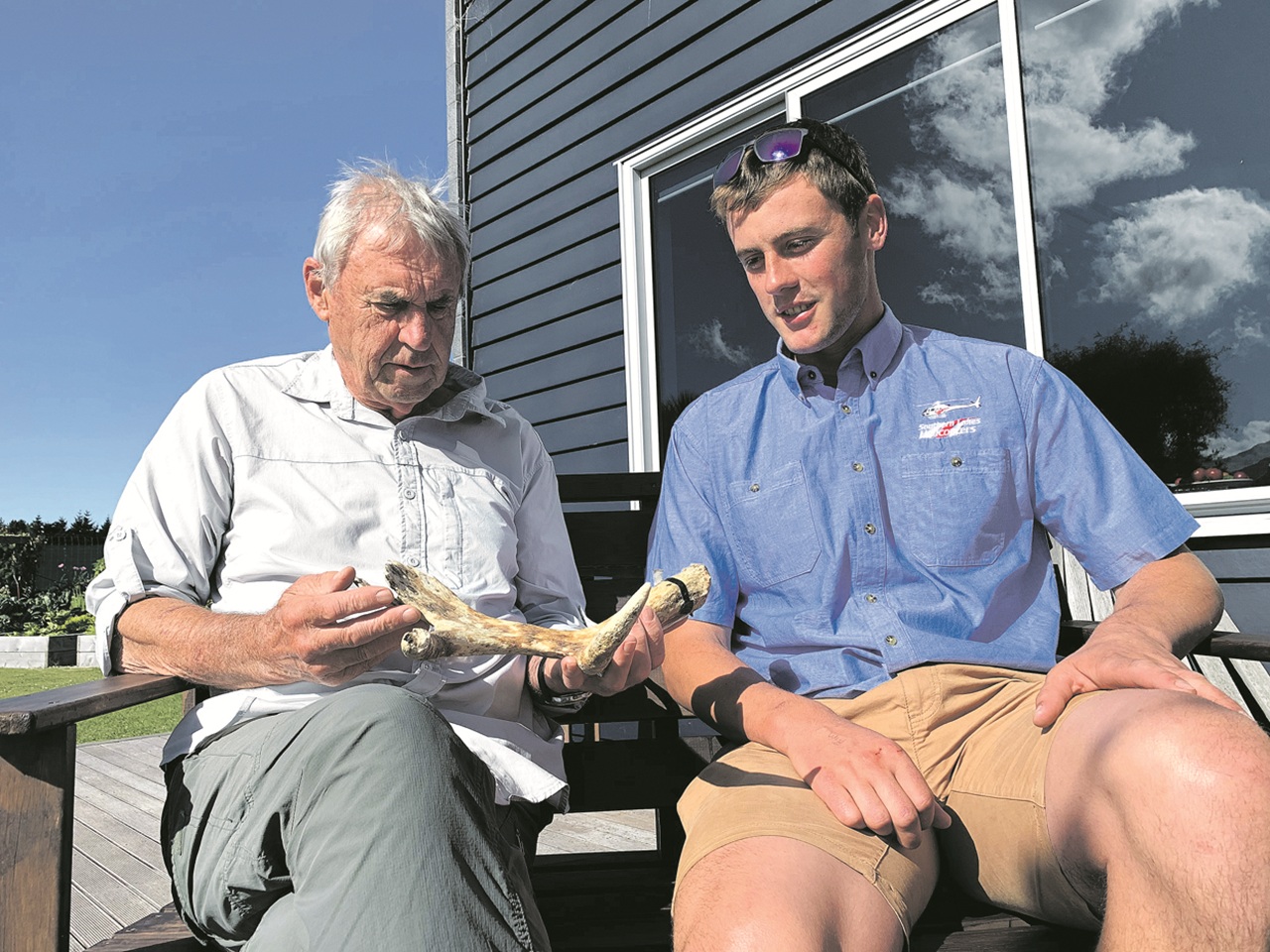 Researcher Ken Tustin and Ben Young in 2020, following Ben's moose sighting while flying north of Doubtful Sound. Photo: Southland App