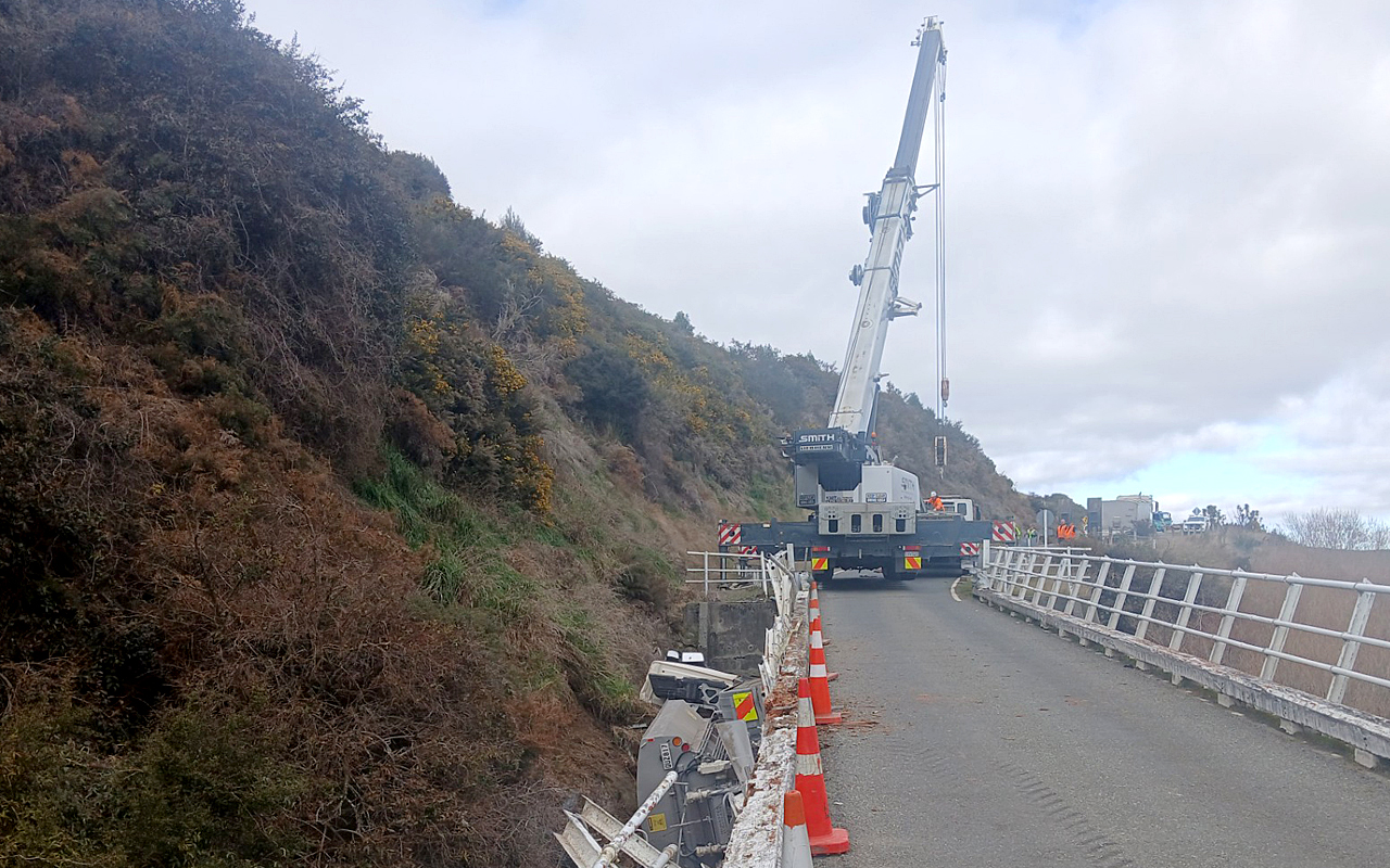 A heavy crane positions itself to lift a crashed truck at Mararoa Bridge on Weir Road. Photo: Southland District Council