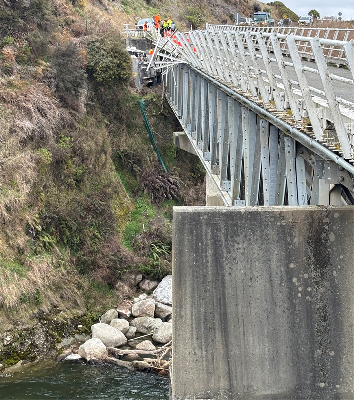 The truck is currently wedged between the bridge and a cliff, around 15 metres above the Mararoa River, on the southern side.